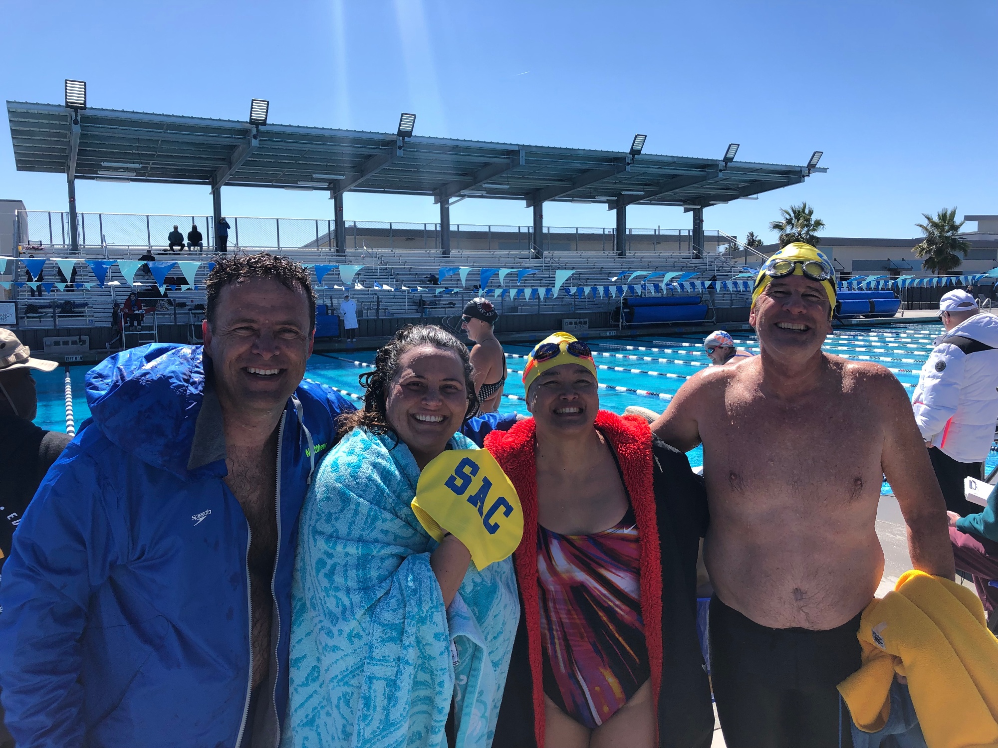 Last weekend in March, we hosted our 50th Pentathlon at North Natomas Aquatic Complex. The Pentathlon consisted of 5 races; 100 yd Fly, 100 yd Back, 100 yd Breast, 100 yd Free, and the 200 yd Individual medley. The person with the lowest combined time wins a towel! In addition, there were relays. Thank you to everyone who participated including the meet directors, swimmers, officials, announcers, timers, and the other volunteers setting up and taking down the meet, working the snack bar and registration. You made the meet a success!